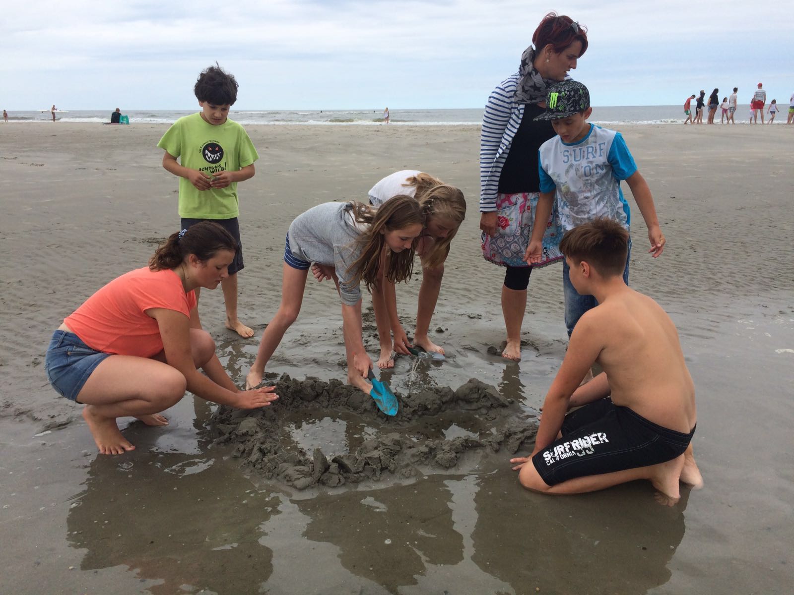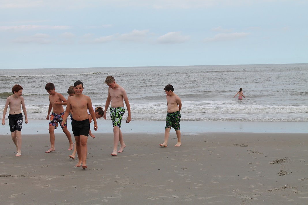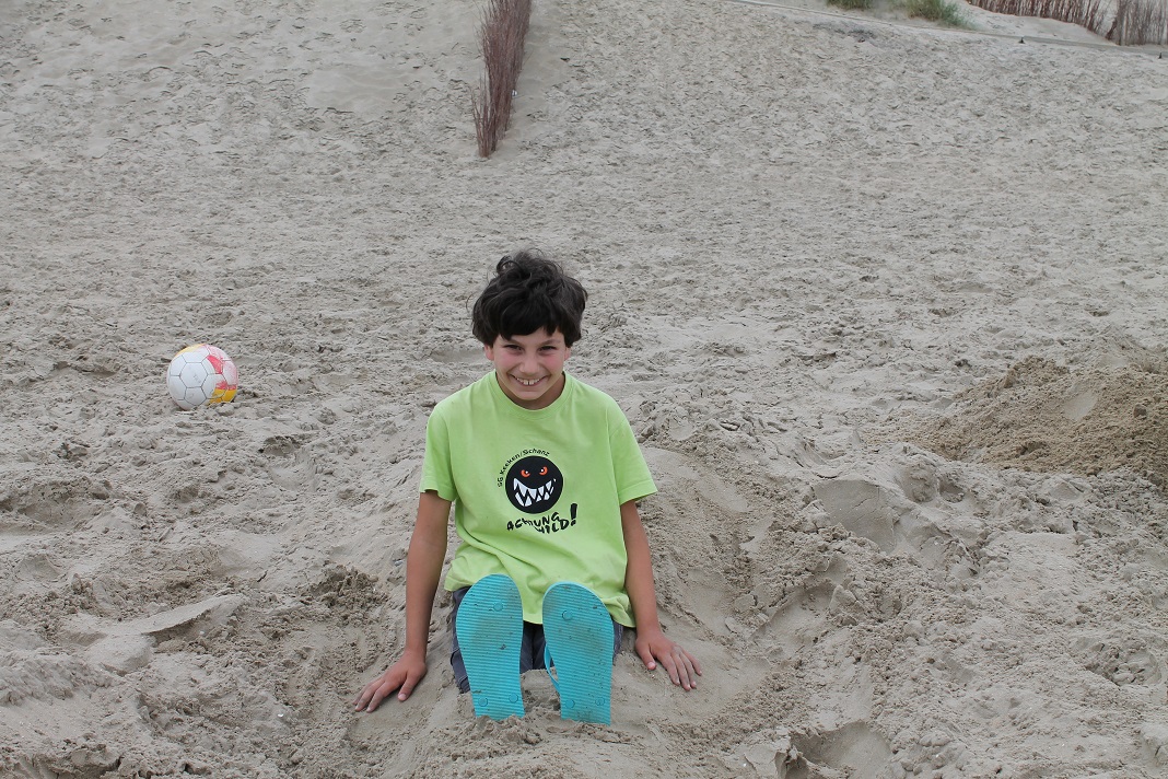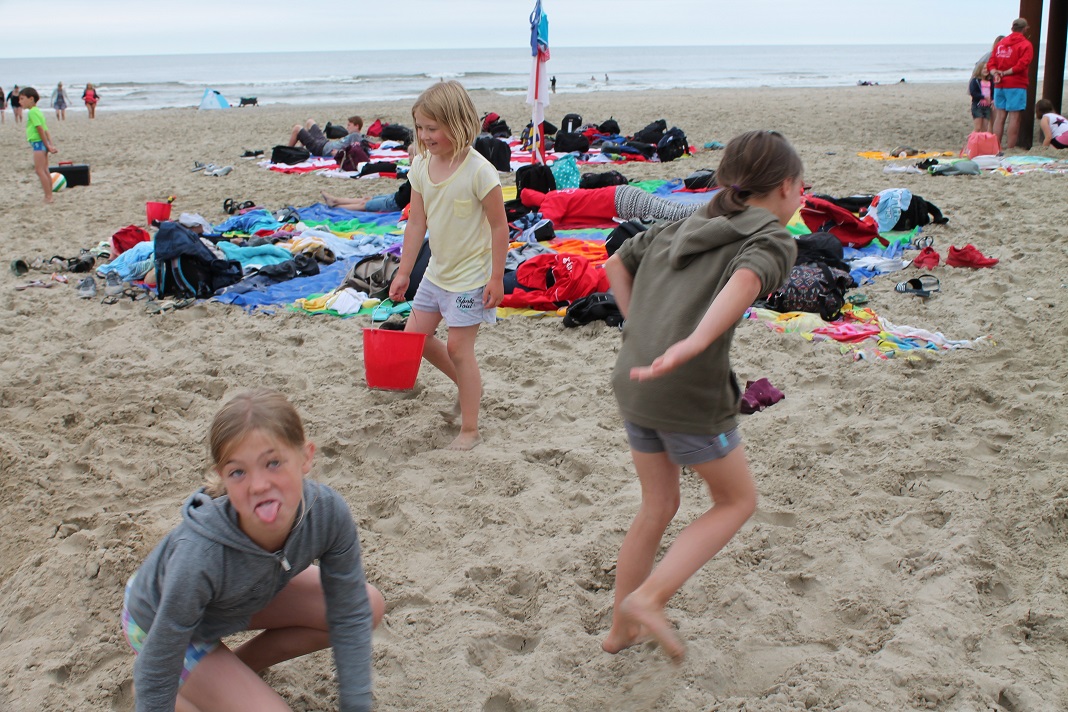 Die großen Jungs waren schon morgens um 6 Uhr unterwegs und sind mit Betreuerin Marion joggen gegangen. Der Rest hat währendessen noch im Bett geschlummert. Nach dem Frühstück wurden Sachen und Spielzeuge gepackt. Bei etwas bewölktem Himmel zogen wir gemeinsam los zum Strand. Die einen buddelten sich ein Wohnzimmer im Sand, die anderen spielten Winkingerschach oder Strandtennis.  Muscheln und Krebse wurde auch gesucht und die ganz "harten" waren sogar im 18 Grad warmen Wasser. Wolle und Axel brachten uns gegen Mittag belegte Brötchen und Getränke. Gegen 15 Uhr wurden die Klamotten dann wieder zusammen gepackt und wir starteten die Rücktour zum Lager. Während die Küche das Essen brutzelte spielten einige Fußball, legten ein paar ruhige Minuten ein usw. Die großen Mädels überkam es und so wurde eine wilde Farbschlacht veranstaltet. Ganz nach dem Motto "T-Shirts bemalen mal anders".