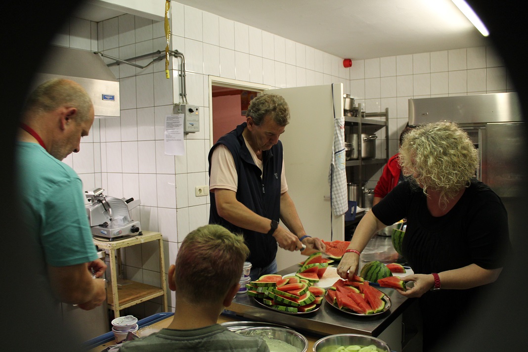 Die Küche hat sich mit dem Mittagessen mal wieder selbst übertroffen. Es gab Nudeln und/oder Reis mit Geschnetzeltem und Gurken- und Blattsalat. Und zum Nachtisch frische Melone.