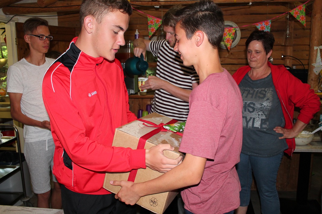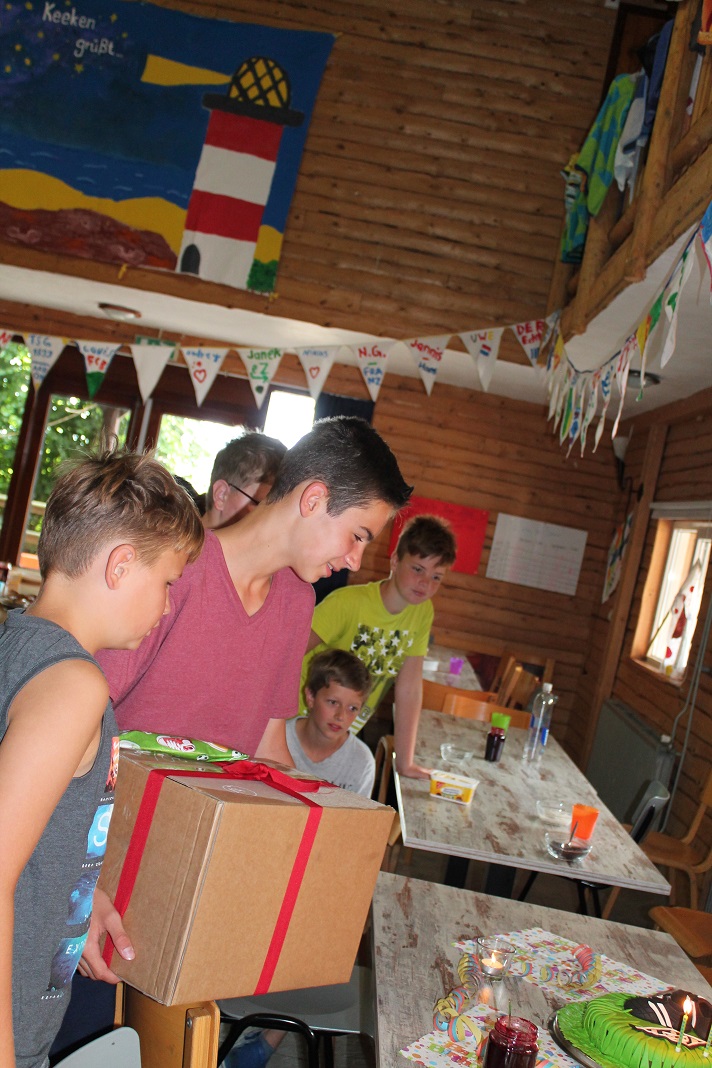 Da Raphael Geburtstag hatte, haben wir gespannt auf ihn gewartet und gesungen als er die Treppe runter kam. Auch im letzten Jahr war Raphael ein Lagergeburtstagskind. Seine Gruppe überreichte ihm sein Geschenk von Zuhause und es gab auch ein Geschenk von uns. Die großen Mädels haben für Raphael eine Gladbachtorte gebacken. Mit Fondant und leckerer Schokobuttercreme wurde ein richtig schöner Kuchen gezaubert.
