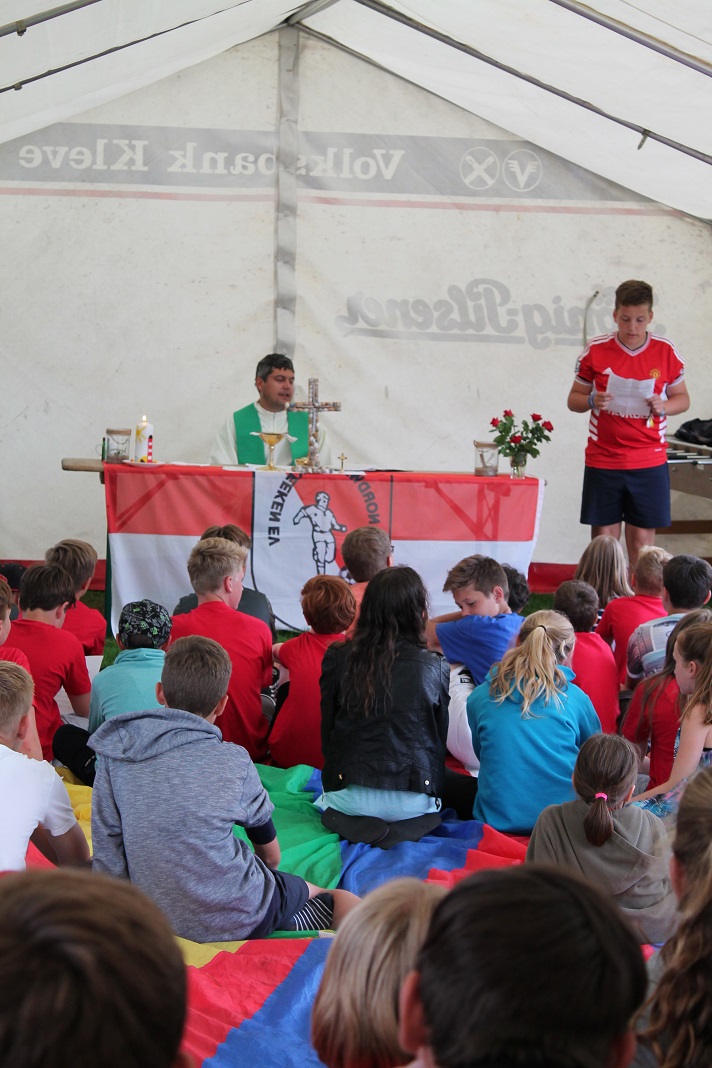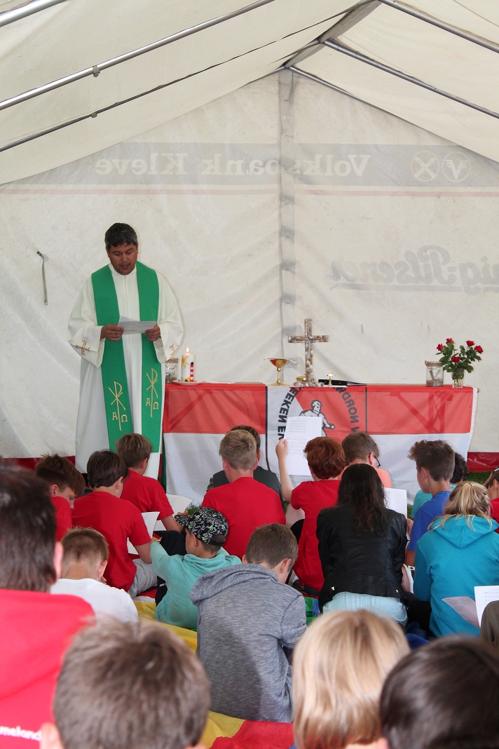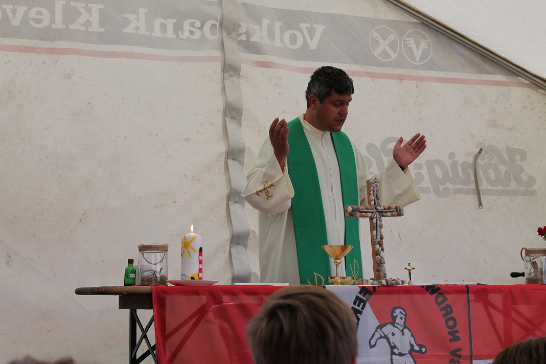 Vor dem Abendbrot trafen wir uns noch zur Lagermesse im Zelt, die Pastor Iulian für uns vorbereitete. Mit dem von Yasmin gebastelten Kreuz und der Lagerkerze wurde der Nordwachtaltar verschönert. Unsere Kinder haben Fürbitten vorgelesen und kräftig mitgesungen. Anschließend gab es dann für alle Abendbrot.