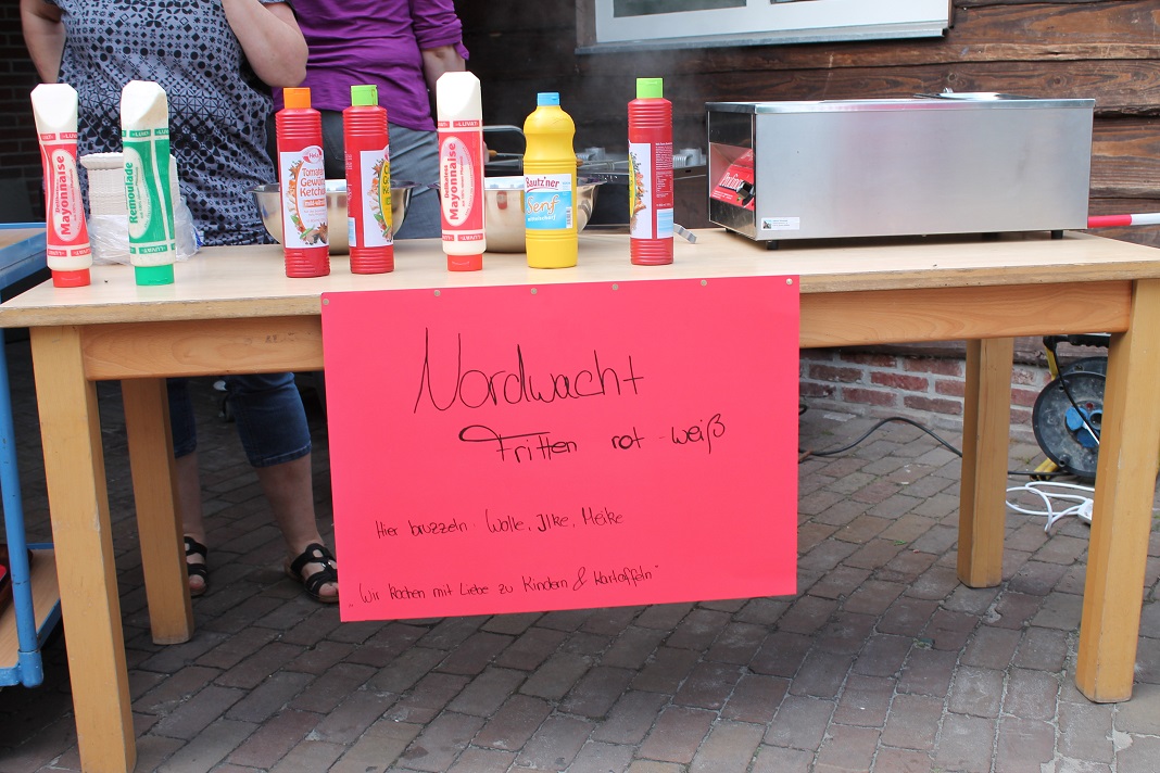 Zum Abendessen besuchten wir alle unsere hauseigene Frittenbude "Nordwacht Fritten rot weiß". Wolle, Ilke und Meike verarbeiteten 18 kg Pommes, 120 Stk Bratwuuuuuurst und 4 Ltr Sansibar-Currysoße nach dem Originalrezept aus Sylt.