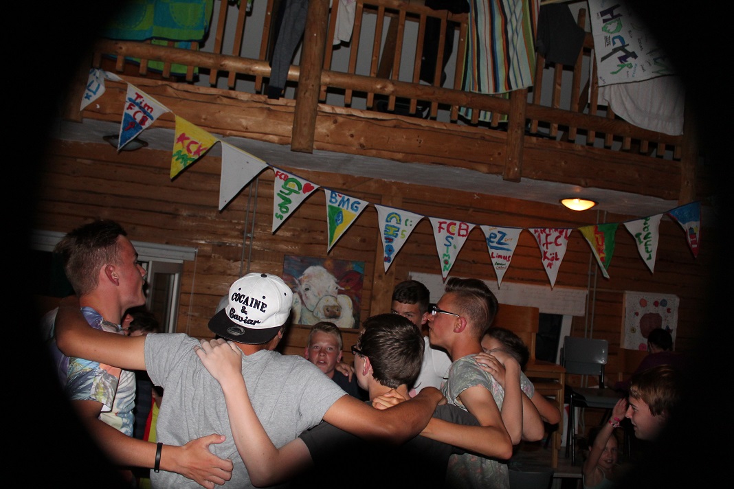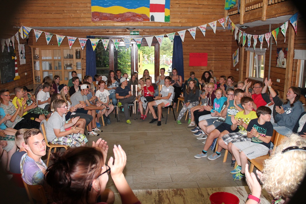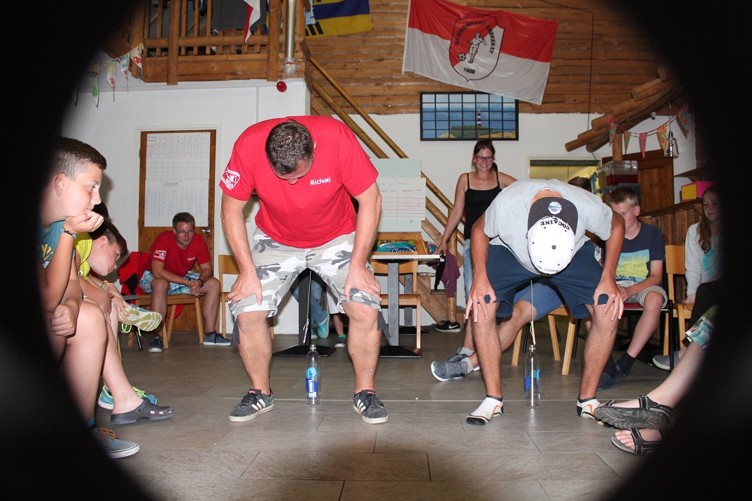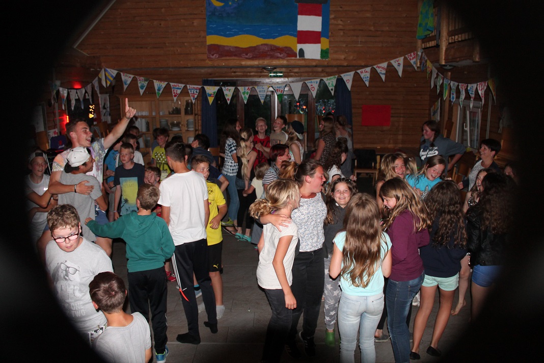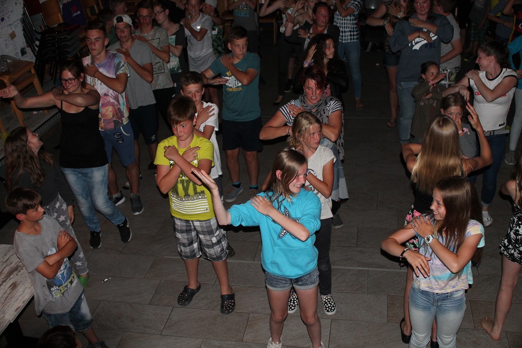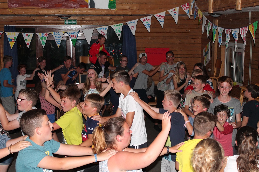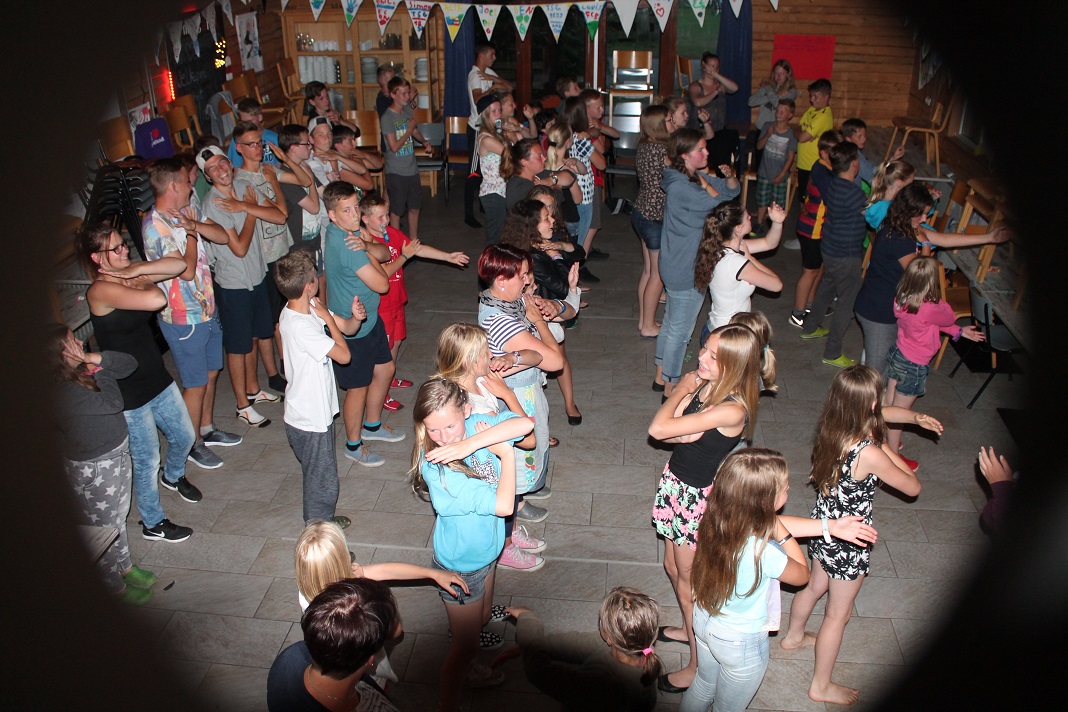 Danach gingen einige duschen, räumten auf oder spielten weiter auf der Wiese. Um 20:30 Uhr startete dann unser Abendprogramm. Mit den Moderatorinnen Anja und Jacky spielten wir das Spiel "Schlag den Betreuer". Mit Spielen wie Postkartenpuzzle, Stift in Flasche, Wattebäuschen pusten usw. hatten wir eine Menge Spaß. Leider haben die Kinder die Betreuer mit einem Punkt Unterschied nicht schlagen können. Trotzdem war die Stimmung auf dem Höhepunkt und so machte "DJ Wolle" spontan den Speiseraum zur Tanzfläche. Somit war auch dieser Tag wieder ein äußerst gelungener für uns.