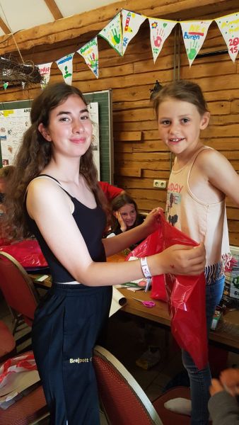 Bevor wir mit unserem Frühstück anfingen, besuchte uns die Zahnfee "Denise". Unsere Cassandra bekam eine "Schneekugel" und ein bisschen Schnuppi. Somit startete für uns der Tag schon sehr lustig. Heute besuchte uns das Ferienlager Nütterden um gegen uns Fußball zu spielen. Unsere jüngsten Kinder fingen an und spielten 5:5, die Jugend ging mit einem 4:1 Sieg vom Platz und die Betreuer gewannen mit 6:1. Alle Kinder die nicht Fußball spielten haben kräftig angefeuert, mit selbst gebastelten Bom Boms. Heute zauberte die Küche Bratwurst, Kartoffeln, Bohnen und Apfelmus. Zum Nachtisch gab es LECKAAAAAH Vla. Nach dem Essen wurde das beliebte "Mörderspiel" erklärt. Jan und Nils haben dieses vorbereitet und es ist im vollem Gange. Das Spiel läuft am Donnerstag erst aus. Da geben wir dann den Überlebenden bekannt.