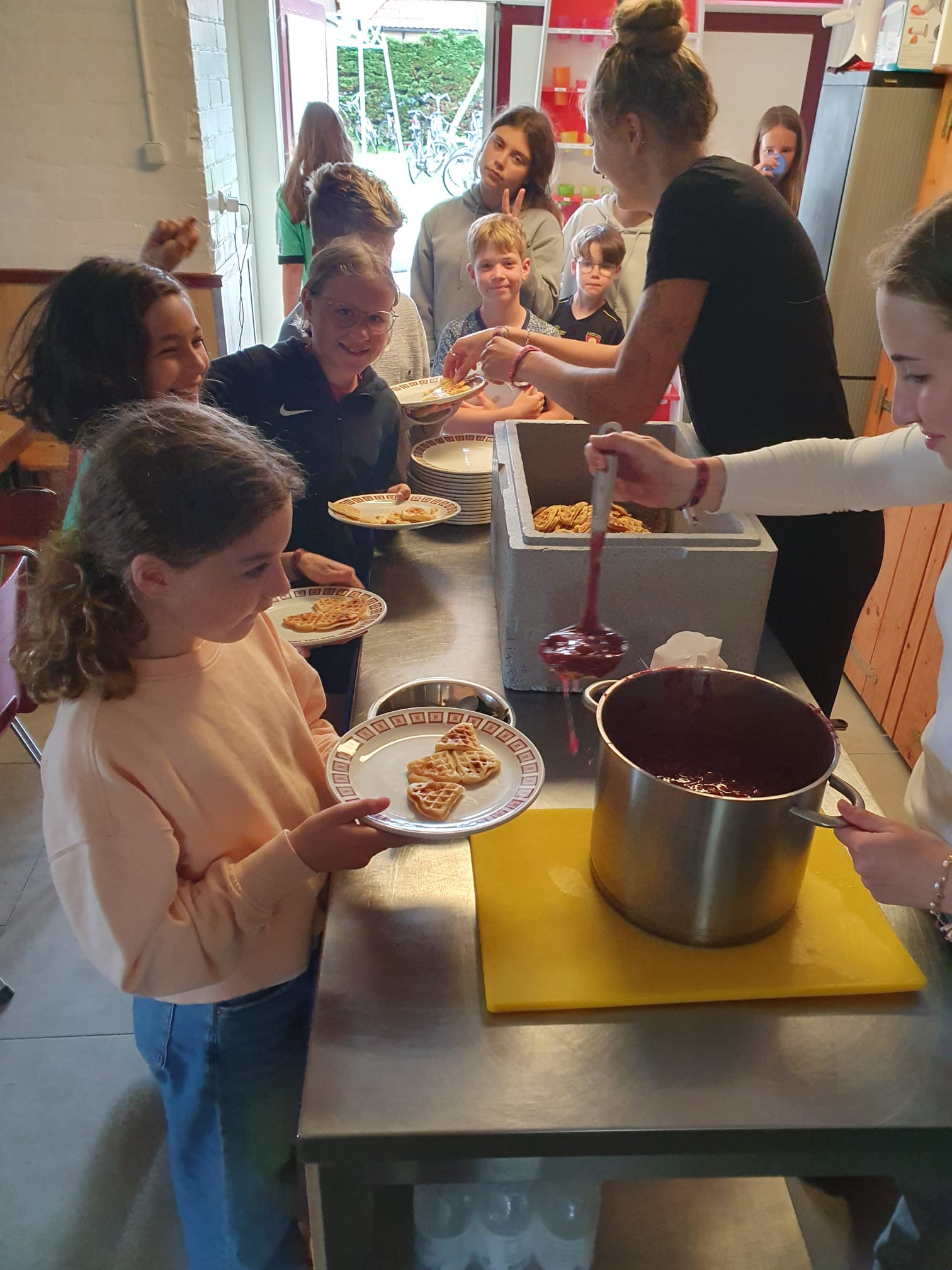 Nach dem Frühstück gab es auf unserer Außenwiese ein Völkerball- und Wikingerschachturnier, während Jacky von halb 11 bis 16 Uhr Waffeln für alle zauberte. Natürlich mit heißen Kirschen und Puderzucker. Wir konnten diese Leckrigkeit schon bis draußen riechen und stürmten alle los als es um 14 Uhr hieß: Es gibt Waffeln mit heißen Kirschen und Puderzucker.
