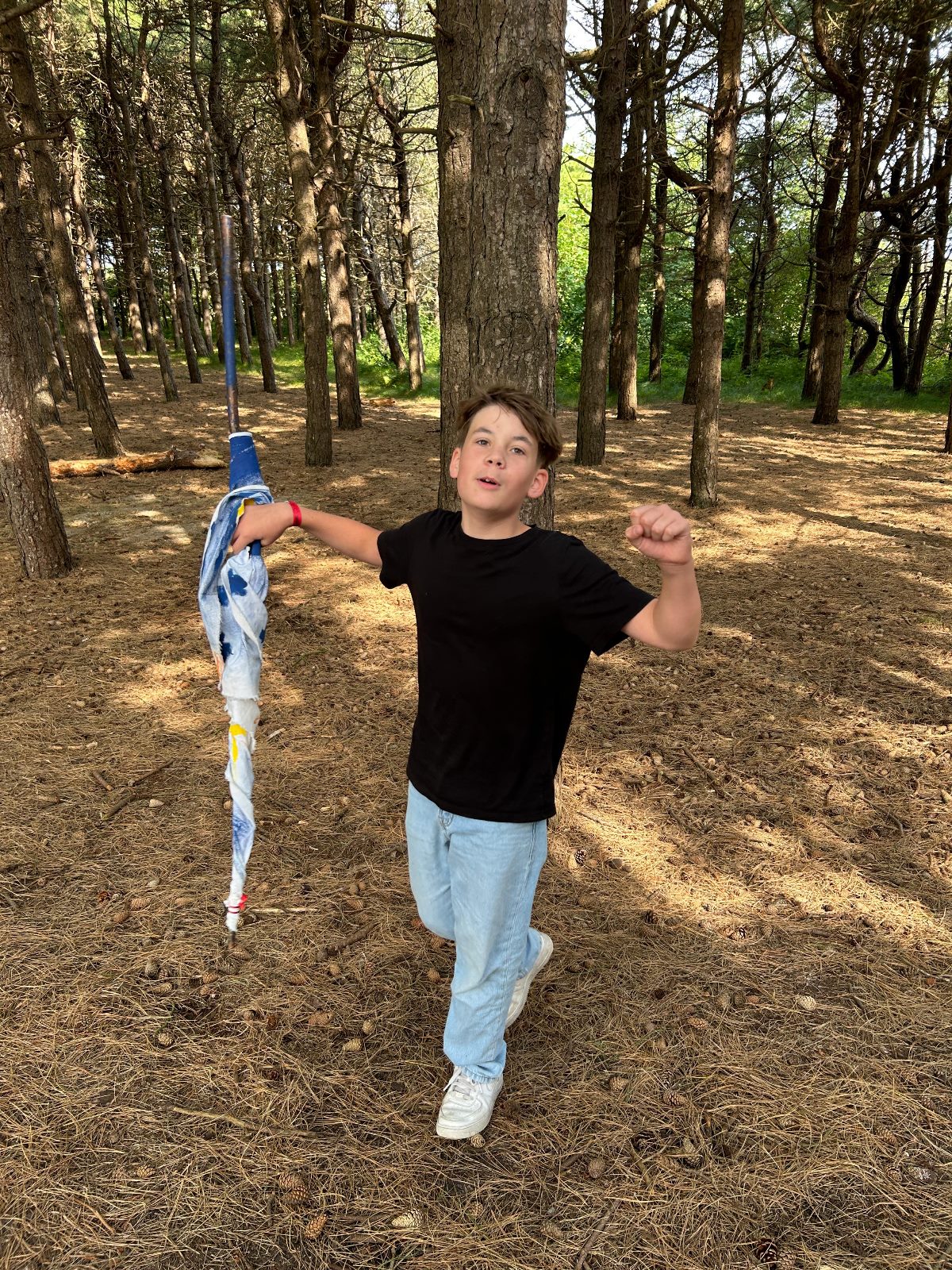 Die großen Jungs spielten Catch Up the Flag im Wald.